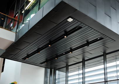 Hunter Douglas have supplied a variety of their 80B, 130B and 180B Multi-Panel ceilings, in black for the futuristic new £35million City Campus for Newports University, which will be home for the Newport Business School and the design, film and digital media aspects of the Newport School of Art, Media and Design. The new building is on schedule for its opening early next year. Construction work on-campus, the first phase of an intended £50m development for the University with partnership funding from Newport City Council and Newport Unlimited, is being carried out by Willmott Dixon.