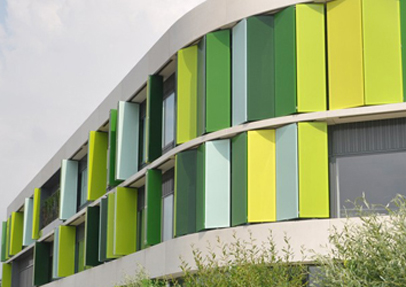 The system blocks heat as well as light. The school is a so-called fresh school type B with an Energy Performance Coefficient value of 0.7 that makes it almost energy-neutral. The result is a very colourful façade. To add to the green look, ivy is growing up some of the façade parts.