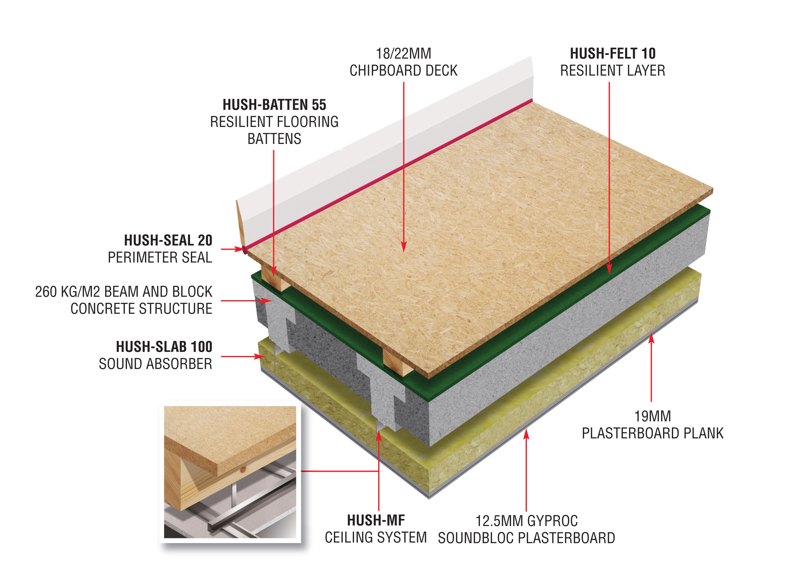 Integrating Hush Acoustics’ products and systems into the design of floors and walls, whether these are of timber, concrete / masonry or metal construction, helps to ensure the finished building meets the Building Regulations in all UK nations, including Approved Document E in England & Wales. And for clients who are looking to go beyond an acoustic design that simply aims for compliance, the Hush Acoustics team can help architects develop a specification that will provide living spaces capable of receiving the highest satisfaction ratings.