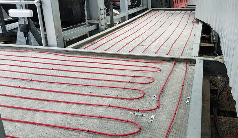 HDS designed and installed an ice and snow melting system with 6 x 4455w HDS outdoor heating cables fitted to a concrete base, before being covered with concrete.