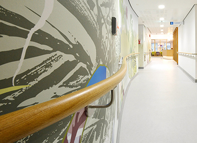 To aid mobility for frail patients and create a warm, soothing aesthetic, CS Acrovyn HRWS6C solid timber handrails on sturdy stainless steel brackets were installed in circulation corridors. Sections of the handrail had to be formed to fit the curve of the wall.