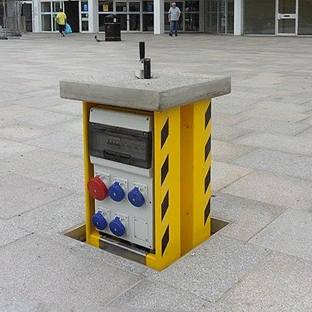 Finally, a power bollard is a power distribution unit that is an elegantly designed piece of street furniture. It is permanently installed, providing access to power sockets as required behind a lockable cover.
