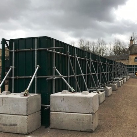 The Kentledge system was chosen because the concrete blocks sit on top of the hardstanding in the courtyards without damaging the surface. The blocks also provide exceptional stability and security.