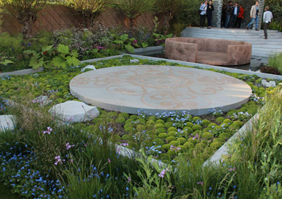 stoneCIRCLE was commissioned by StoneAge to manufacture the round stone floor feature in the middle of the Sentebale Garden at the Chelsea Flower Show. The feature was composed of 125mm thick Pietra Serena limestone which was carved into shape and then inlaid with Santa Fiore marble which had been cut with a water jet to leave 1mm joints. The whole object was then machined flat.