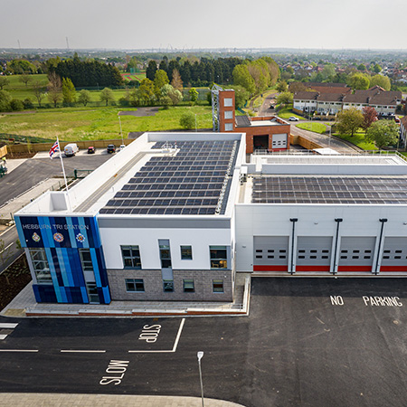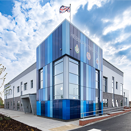 Hebburn Tri-Station is one of 17 community fire stations located across Tyne and Wear in the North East of England. The new carbon neutral station replaces the previous Hebburn Community Fire Station, which served its community for nearly 60 years. Compromising two buildings, the site includes staff accommodation, offices and bays for emergency vehicles, as well as a training facility to support and enhance the skills of specialist rescue, as well as rope rescue fire fighters.