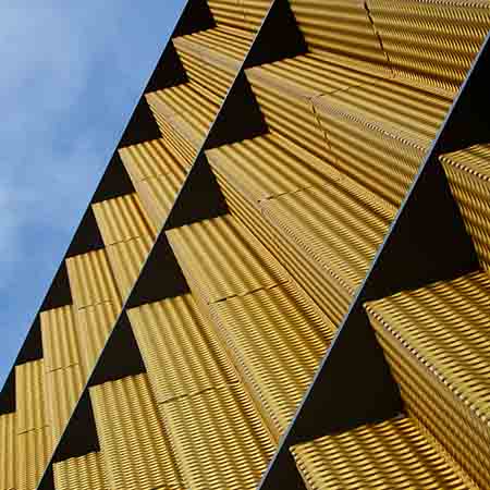 Our Mesh.covering creates captivating visual dynamics, with interactions between light/shadow or solid/void, creating a sense of both modularity and movement. Panels can be curved and shaped in multiple formats. Bold colour palettes are possible, alongside the incorporation of artwork, anodising, and other custom finishes that contribute to the dynamic character of perforated and expanded mesh solutions.