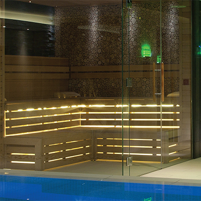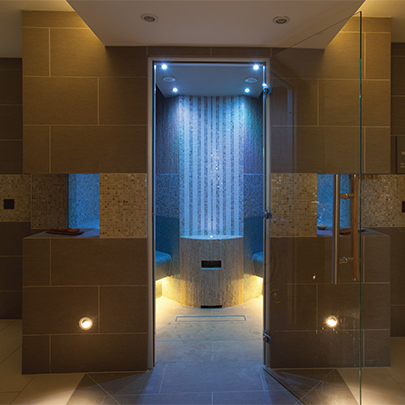 Sparcstudios ornate design for the Rasul has glazed candle niches set into the façade and a curvy interior with two individually heated seats. The two glass walls of the sauna were designed by Sparcstudio to allow views of the vitality pool from within and showpiece the beautiful finishes of the sauna.