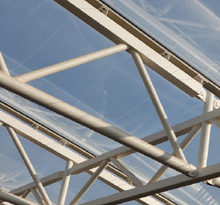 AFP aluminium profiles with an anodized finish hold two-layer ETFE pillows in place.