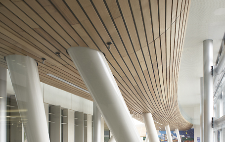 The Hunter Douglas solid wood ceiling system can be specified as either a fixed or demountable system which allows easy access into the void.