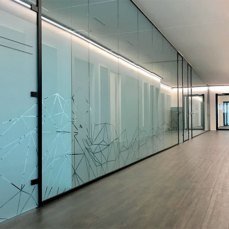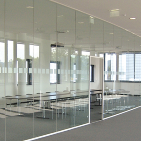 The profiles for Office Partition Systems are suitable for 8 to 16 mm monolithic toughened glass or laminated glass. The EPDM rubbers are available in black or grey. If an enhanced sound insulation is required, the system can also accomodate insulating glass. With the variation “Office XL“ that is suitable for 28 mm glass thickness fixed glass panels sound insulation can go up to 42 dB (decibel level achieved).