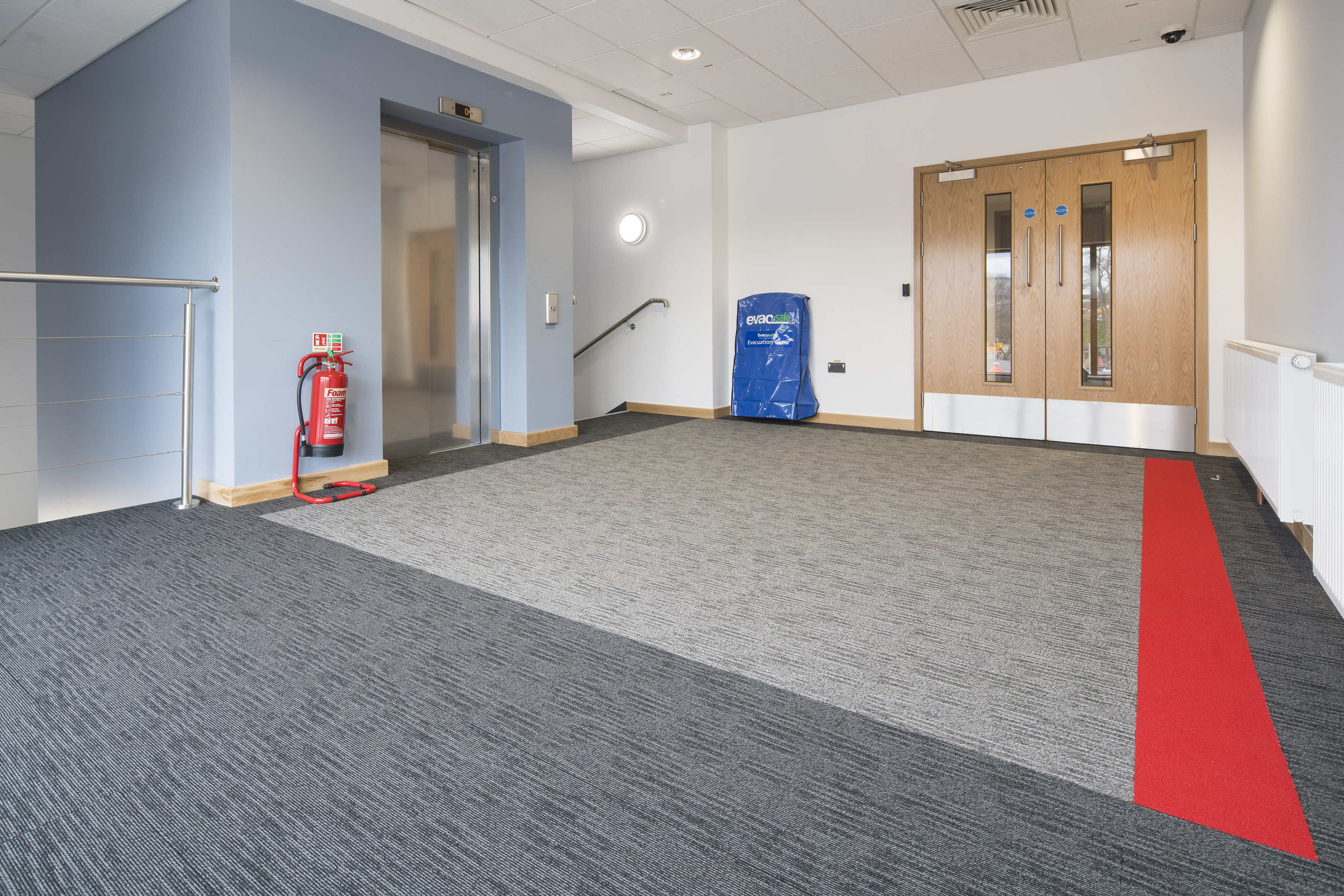 Cityscene carpet tiles were chosen in complementary Basalt and Granite shades. The Emphasis carpet tiles in a contrasting red colour create a bold and interesting pattern, whilst also helping people to navigate the corridors.