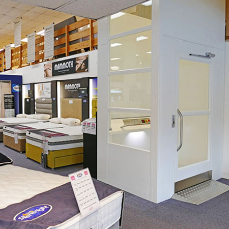 In order to give users of the lift a view of the showroom the unit was partially glazed. This was important so that the visitor to the centre could get a feeling for the amount of choice of beds available to them. A ramp was used at the bottom floor door as the client did not want to form a 60mm pit on this occasion.