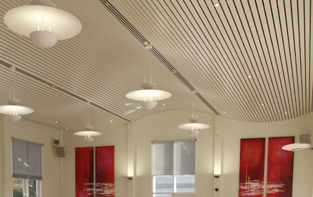 Modernisation and refurbishment of the Penbryn function suite at Aberystwyth University was carried out by main contractor T O Jones & Sons Ltd. Gareth Lewis Architects specified a Hunter Douglas 84R ceiling, finished in White and installed on curved carriers to convex and concave radii to form a waveform pattern. Panels were installed with no joint profile, leaving open joints to maximise airflow and create a feeling of space. The waveform shape of the ceiling added visual interest as well as reflecting and diffusing light from the pendant light fittings, wall mounted up-lighters and natural light from the windows.