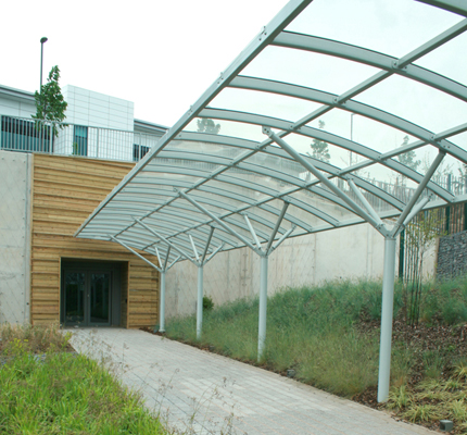 Marshalls Urban Structures' ADI walkway has provided an attractive means of protecting Peugeot staff from the elements when moving between the two parts of the site. The design is also very robust and durable which will allow the walkway to stand up to any attempted vandalism. The finish and colour ensure the product is protected adequately against rust and corrosion, as well as naturally blending into the surrounding area.