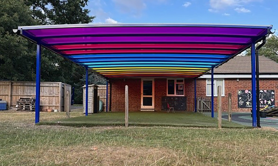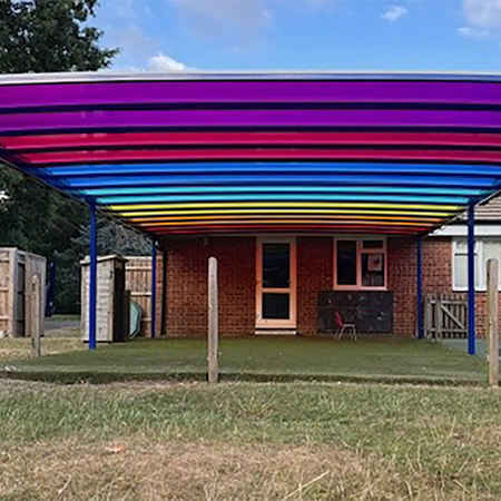 NBB Outdoors’ Solution: NBB Outdoors designed and installed a bespoke shelter measuring L: 9,170mm x D: 5,800mm x H: 2,470mm to deliver the large covered area the school required. The structure included 600mm beam overhangs to both the front and rear, maximising coverage and ensuring effective protection from the elements. To bring the school’s vision of a bright, creative play space to life, the shelter was fitted with a striking rainbow roof, incorporating Cherry Red, Amber, Sunburst Yellow, Sea Grass Green, Pacific Blue, Fuchsia Pink and Violet polycarbonate panels. Guttering was installed on both sides with drainage to ground level only, completing a durable, colourful solution that combines practicality with fun.