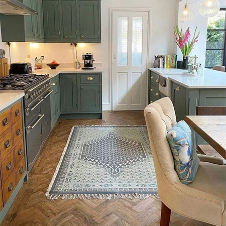 The floor spans the kitchen, dining room and downstairs toilet, which adjoins the kitchen. It has a two-tile-width border, which Stacey chose after using the online Polyflor flooring visualiser to see how the pattern and colour of tile would work against their Scandinavian-style green kitchen cabinets, white quartz worktops and brass door handles.