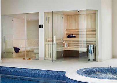 The sauna and steam room are situated within the leisure complex adjacent to the house. The frameless glass doors and full glass frontage ensure a feeling of space and a perfect view over the pool and beautifully landscaped grounds beyond.