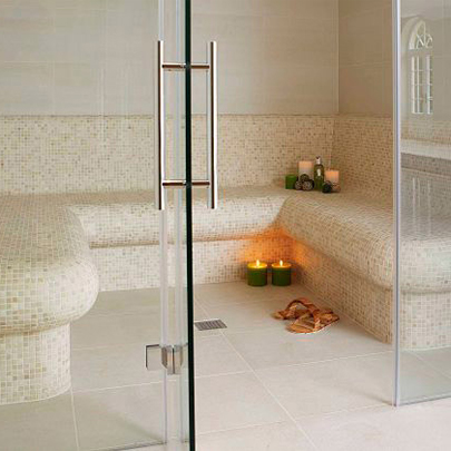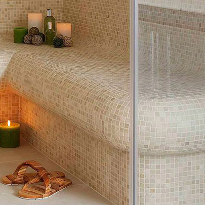 Within the 2.2m square steam room, large format porcelain tiles line the walls and ceiling while Crema Marfil tumbled mosaic provides a stylish finish to the elegantly contoured benches. Digital control systems allow adjustment of the two steam outlets and the LED lighting in the ceiling to create an ideal bathing environment.