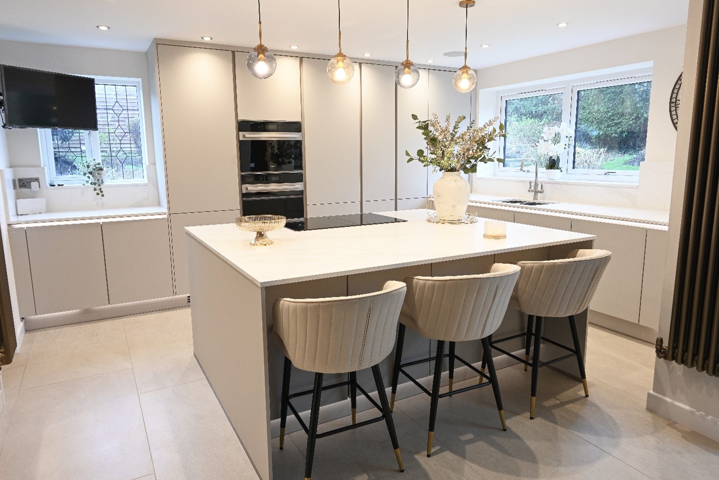 Kitchen finished in our PG4 EasyTouch Sand door, with Line N handles, handle lighting and plinth lighting, that the client was looking forward to using as mood lighting when having family gatherings!