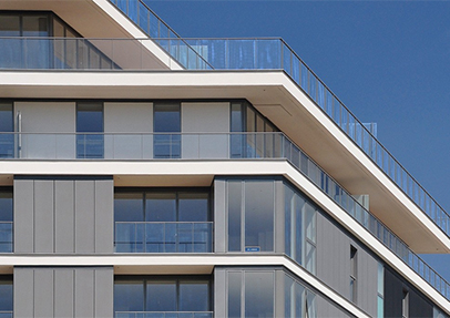 Here, the Proteus HR panels in grey and black zinc complement areas of full-length glazing while the dark grey PPC panels sit more discreetly in between balconies overlooking the River Thames.