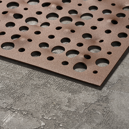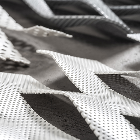 The mesh facades are produced to exacting standards, ensuring high quality and tight tolerances for enhanced fabrication precision. Cladding panels are made from aluminium alloy sheets and can be oriented both horizontally and vertically from a number of coil widths, and a minimum standard thickness of 3mm, also perforated for performance. These panels are crafted through cutting, drilling, and two or three-dimensional forming, with edge profiles to form an encapsulating frame, to provide rigidity and enable concealed fastening.