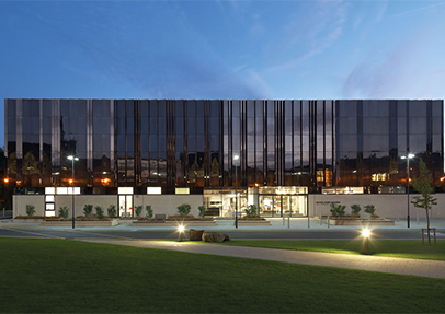 The £6million Michael Marks Building on the university’s Western Campus follows the golden rule of architectural design “Form follows function”, combining within the façade the high strength, low maintenance and excellent corrosion resistance of stainless steel with a visually contemporary finish. Broadway Malyan were looking for an envelope system that would give the variety of panel sizes required for their design as well as flatness, a mirror finish and long-lasting aesthetics, with Proteus HR’s lightweight aluminium honeycomb core providing a perfectly flat finish coupled with very large panel sizes and recessed joints.
