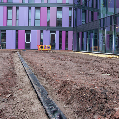 The new Oldham Academy North, designed by architectural practice Aedas Architects, is a spacious and colourful three storey building set in sensitively landscaped grounds. With the site being quite flat, and the building surrounded by paved and asphalted surfaces, it was essential rainwater is drained effectively.