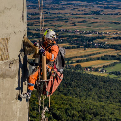 For the renovation of the cracked reinforced concrete structure of the tower, a one-way PBO-MESH 88 (formerly RUREGOLD XT CALCESTRUZZO) reinforcing mesh made of 50 cm wide PBO synthetic fibers and a dedicated mineral, polymer-modified MX-PBO Concrete mounting mortar were used. On the section of 40m, 40 reinforcing belts were made at intervals of 50cm. The material, normally available in rolls with a length of 15m, were individually adapted to the specific project and delivered in a length of 16m, which allowed the tower to be wrapped in one section of mesh and avoided additional joints and material losses.