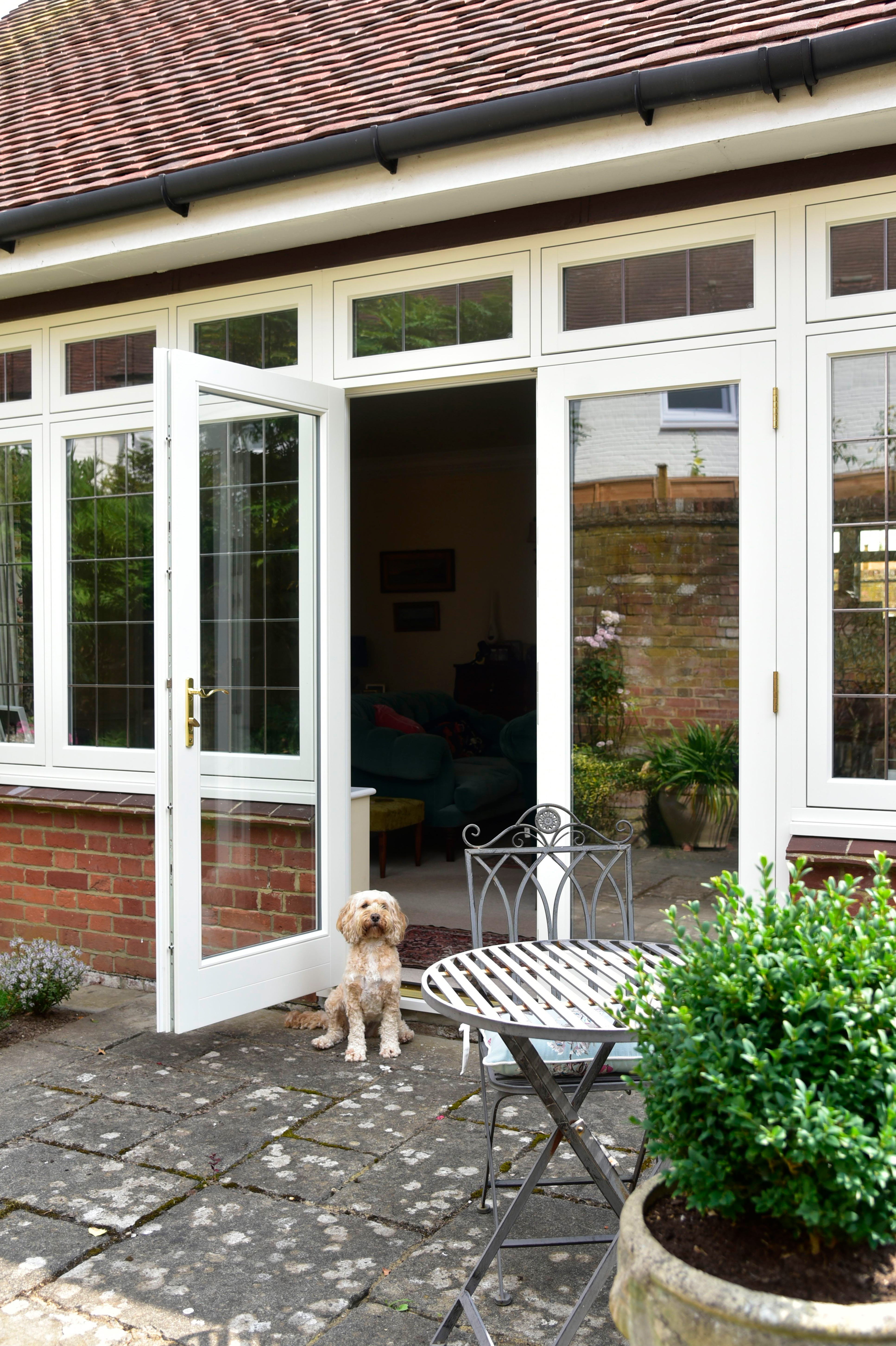 Creating quite the statement piece, a feature set of French timber doors with flush casement windows to both sides has been installed in Mr Allan’s home. Finished in the shade of ‘Pure White’ and enhanced with leaded light detailing, the new doors and windows provide easy access for Mr Allan and his dog into his beautiful garden.