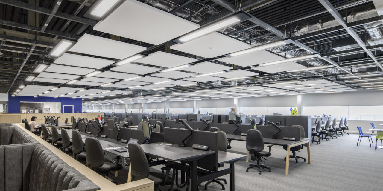 In the vast, open plan work spaces around 600 square format Rockfon Eclipse® Islands have been used to control sound and diffuse the visual impact of the exposed mechanical and electrical services above.