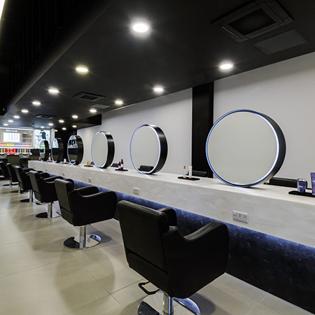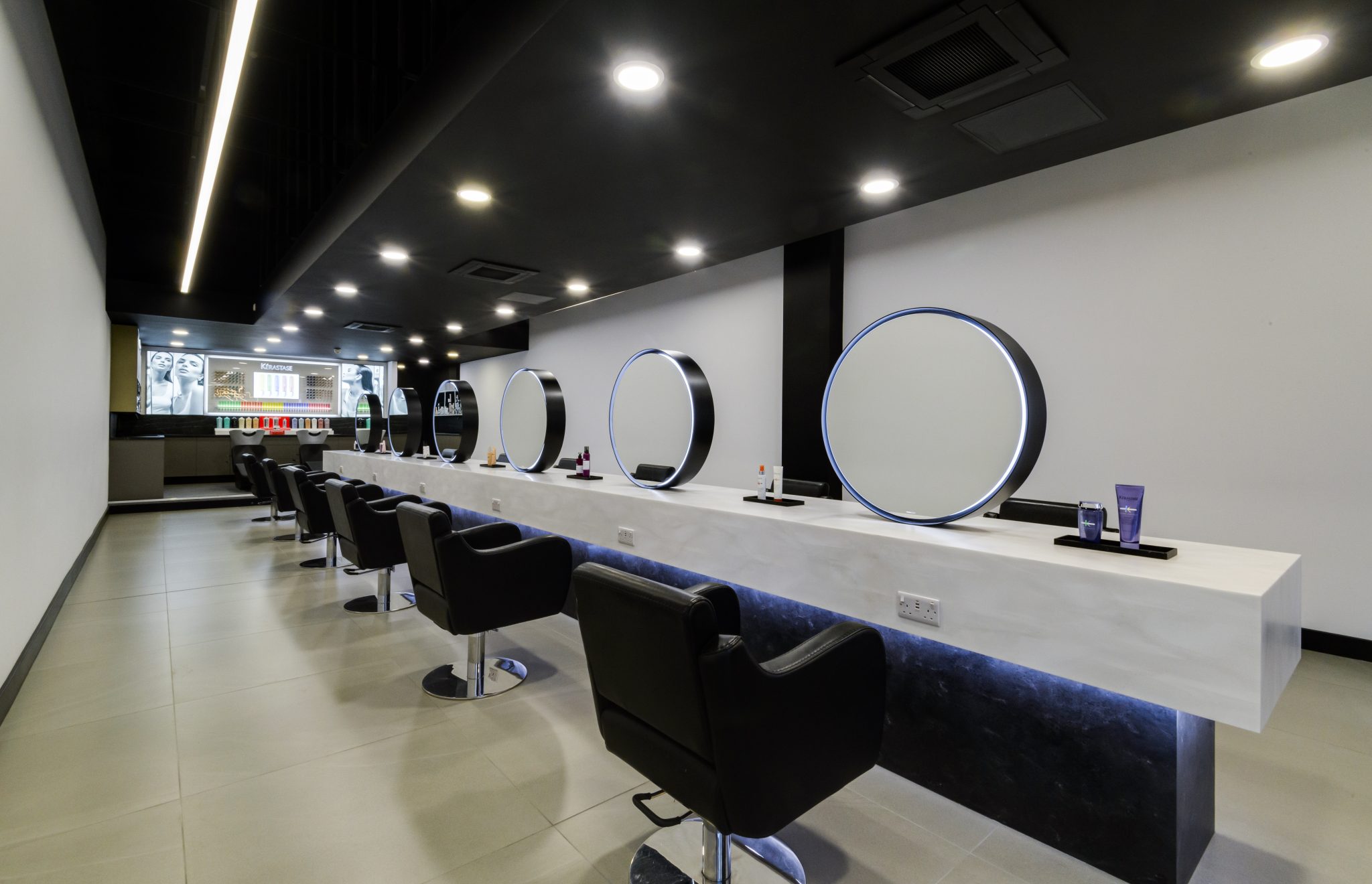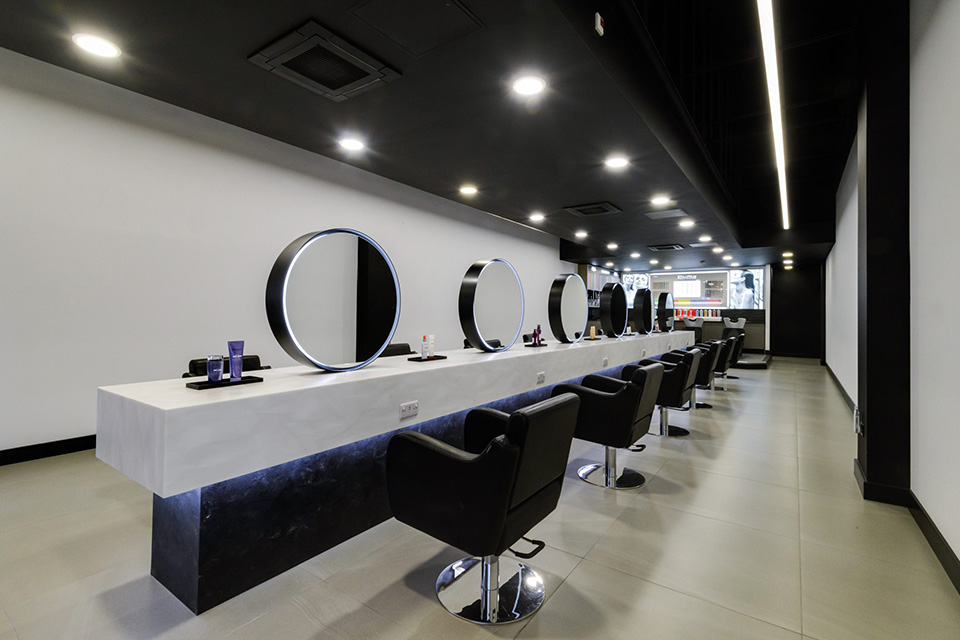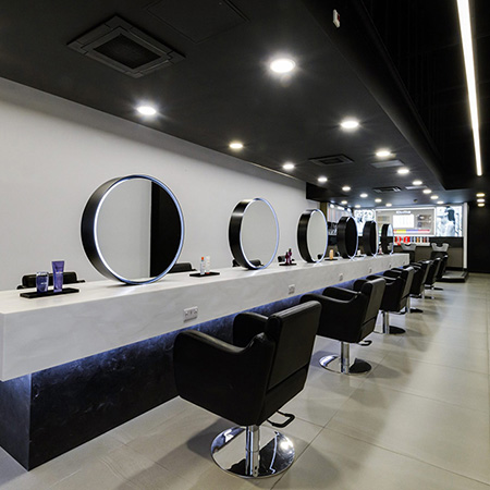 A striking 12-metre continuous Hanex® counter was fabricated to accommodate the stylist chairs and backlit circular mirrors. The seamless installation delivers a clean, uninterrupted line that enhances the sense of space and light.