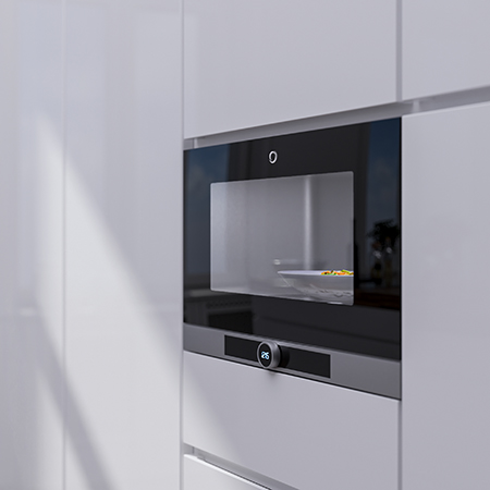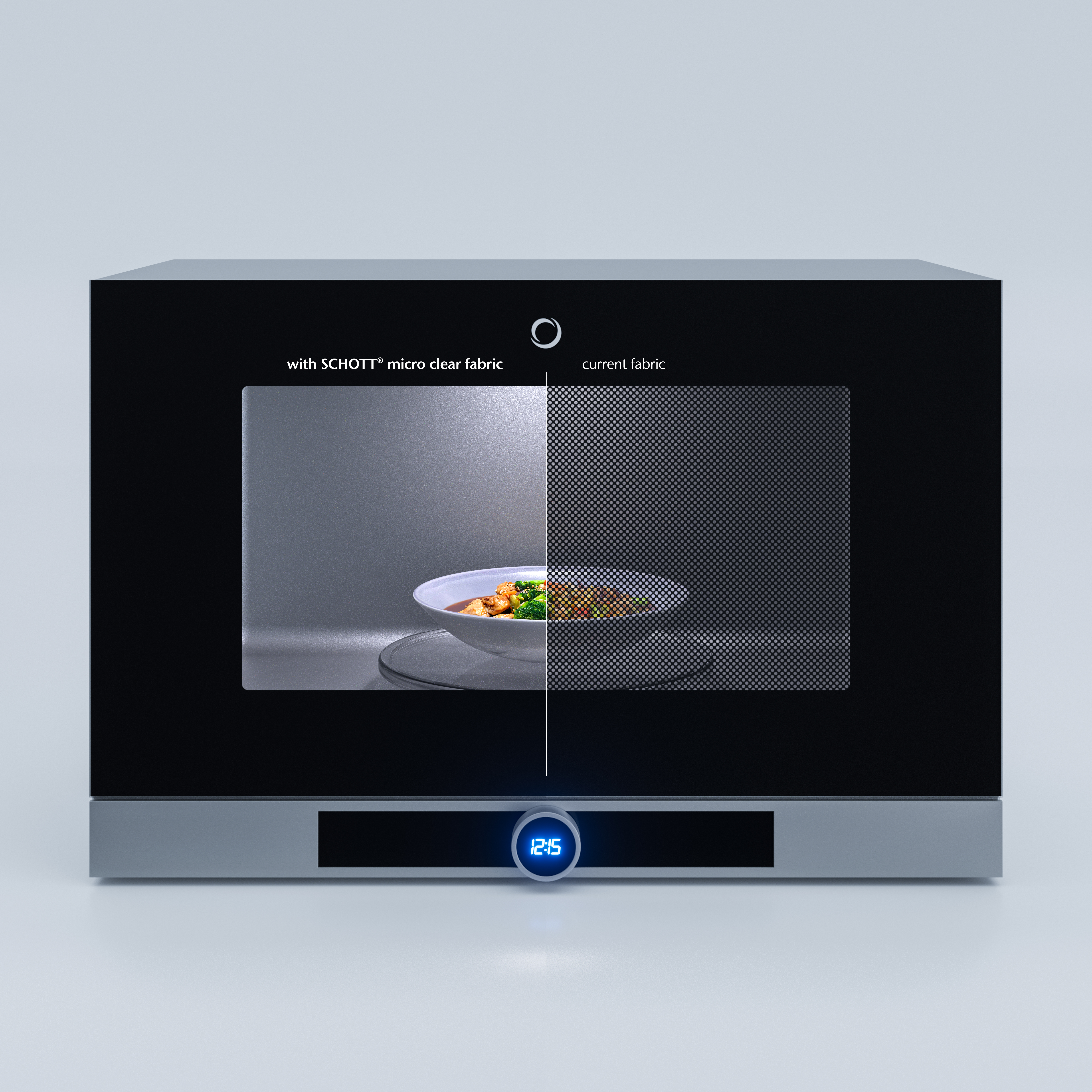 Microwave ovens use electromagnetic waves to heat water molecules in food. To prevent this radiation from escaping, where it could affect sensitive organs such as the eyes, the appliance must be shielded – and the door, which provides access to the interior, always poses a challenge in this regard. The current industry standard with metal grid technology is visually limiting, looks outdated, and does not align well with design trends. These trends follow the principle of family design, in which different kitchen appliances are visually coordinated. With its transparent, modern appearance, SCHOTT® micro clear fabric meets exactly this demand and integrates seamlessly into the look of premium kitchens.