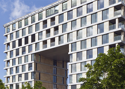 The high-value Kavci Hory residential complex in the south of Prague consists of two parts, a 12 story tower, with a conspicuous opening, and a smaller 6-story building next to it. All of the 88 luxury apartments in the complex are generously illuminated. Built using natural stone, glass, and high quality woods, they have large loggias and terraces. The stone façade was supplemented by Schüco ADS 75.SI and AWS 75.SI aluminium systems and generously glazed to afford a view of Vltava river and the old part of Prague.