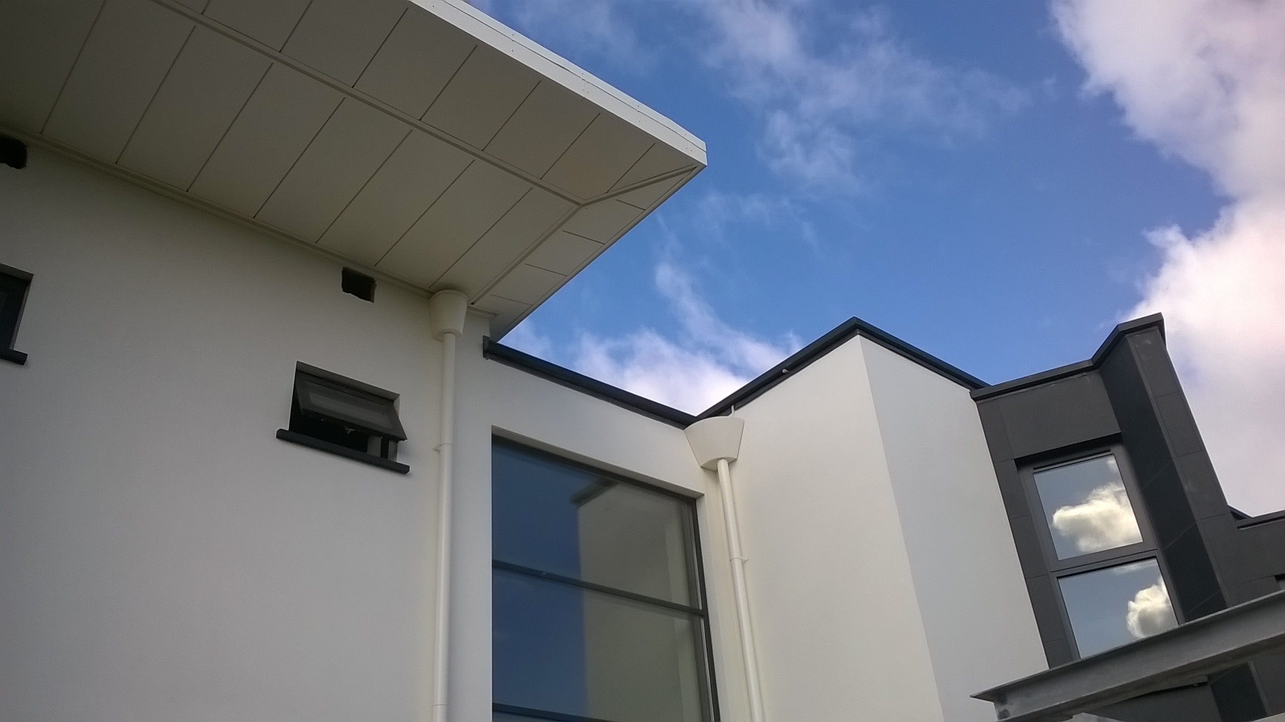 The building is designed to take advantage of the beautiful sea views, with extensive glass panels and white render with granite cladding. Although Skyline products are available in a wide selection of colours, white soffits and fascia were specified to complement the light, airy look.