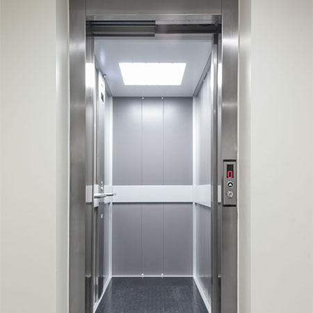 The car interior continues the theme with durable grey vinyl skin plate walls and a black non-slip floor contributing to user safety. The lift travels a distance of 3400mm at a smooth speed of 0.15 m/s.