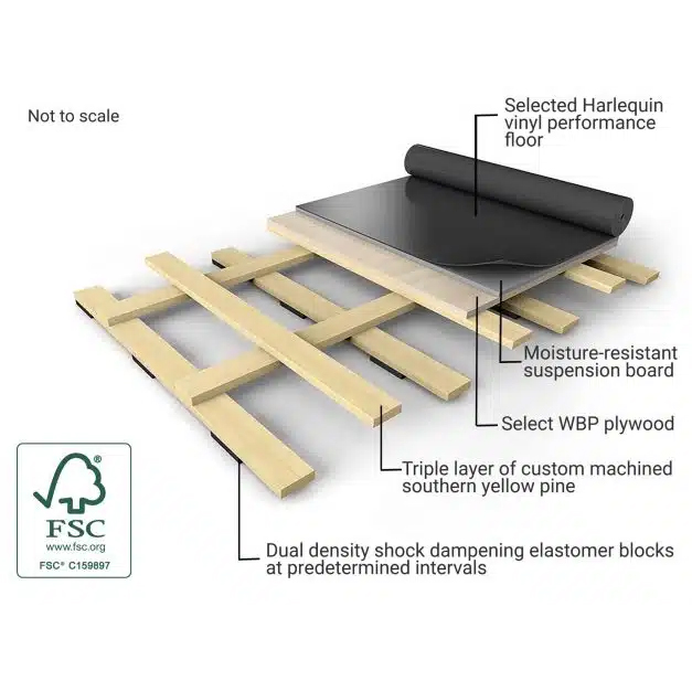 Harlequin Activity is a ‘fully-floating’ sprung floor system without fixings to the sub-floor constructed using Harlequin’s proprietary ‘triple sandwich’ construction method, created over 30 years ago.