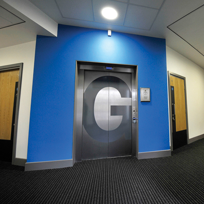 Operating over a distance of 13.2m each, the lifts feature plasticised, light-grey walls, Domino suspended, downlighter-effect ceilings, and stainless-steel consoles, skirtings and car doors. Door-size graphics, G-1-2-3, printed on the external lift doors make the lifts easily located at each floor; and swipe-card access ensures that they can only be accessed by card-carrying users.