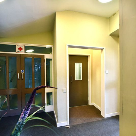 As with all worthy entities, this platform lift operates behind a deceptive exterior – a brown swing door with a glass viewing panel, through which a lift enthusiast would gasp at the original features, such as the original control panel, complete with heritage Stannah logo.