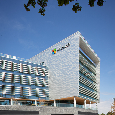 • The facade is Aliva’s second commission for Microsoft in Dublin. It mirrors the aesthetic specified for its Dublin HQ, One Microsoft Place, featuring a silver facade with four distinct anodised aluminium finishes: etched, brushed, polished and natural.