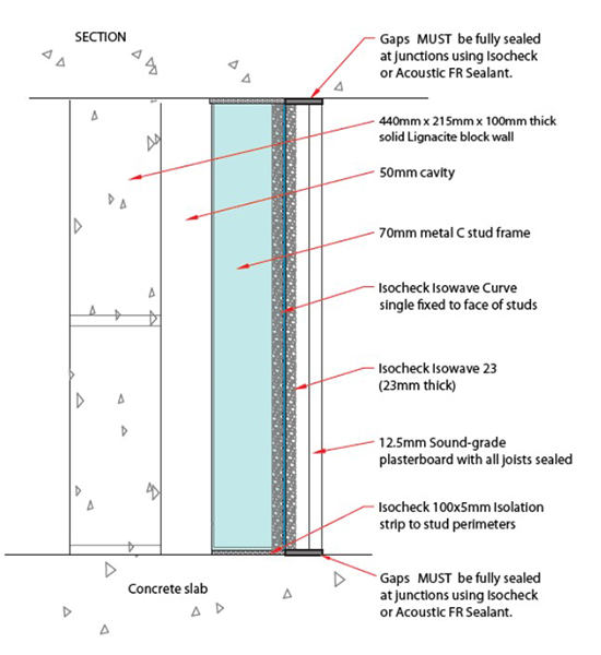 The panel typically comprises a 50 or 70mm ‘C’ stud frame, set back about 15mm from the face of the blockwork, with acoustic quilt or a proprietary board between or over the studs and finished with high density plasterboard. The advantage of this construction is that it allows blockwork to be used fair face one side. The blockwork and acoustic panel act together to provided elevated levels of sound insulation.