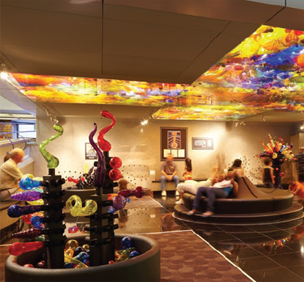 Fireworks of Glass is the largest permanent sculpture of blown glass by renowned glass artist Dale Chihuly. The 43 ft tower of glass rises above a glass platform ceiling furnished and installed by Novum. The platform is a plus sign in plan. The bottom and sides of the platform are point supported glass. The top of the platform is walkway supported glass. The glass floor is supported by a grid of secondary hollow steel sections. The base serves as a colorful ceiling for an activity center for children on the first level of the museum.