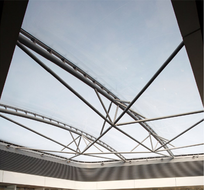 AFP Aluminum profiles with an anodized finish hold three layer ETFE pillows. The top layer of ETFE features a screen print for solar control