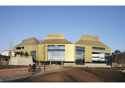 Pennant sandstone cladding for the plinth of The Hive and a complete package of hard landscaping products work to complement the brash, stark lines of the building and the striking gold of the roofline, comprising of seven, copper alloy clad funnels.
