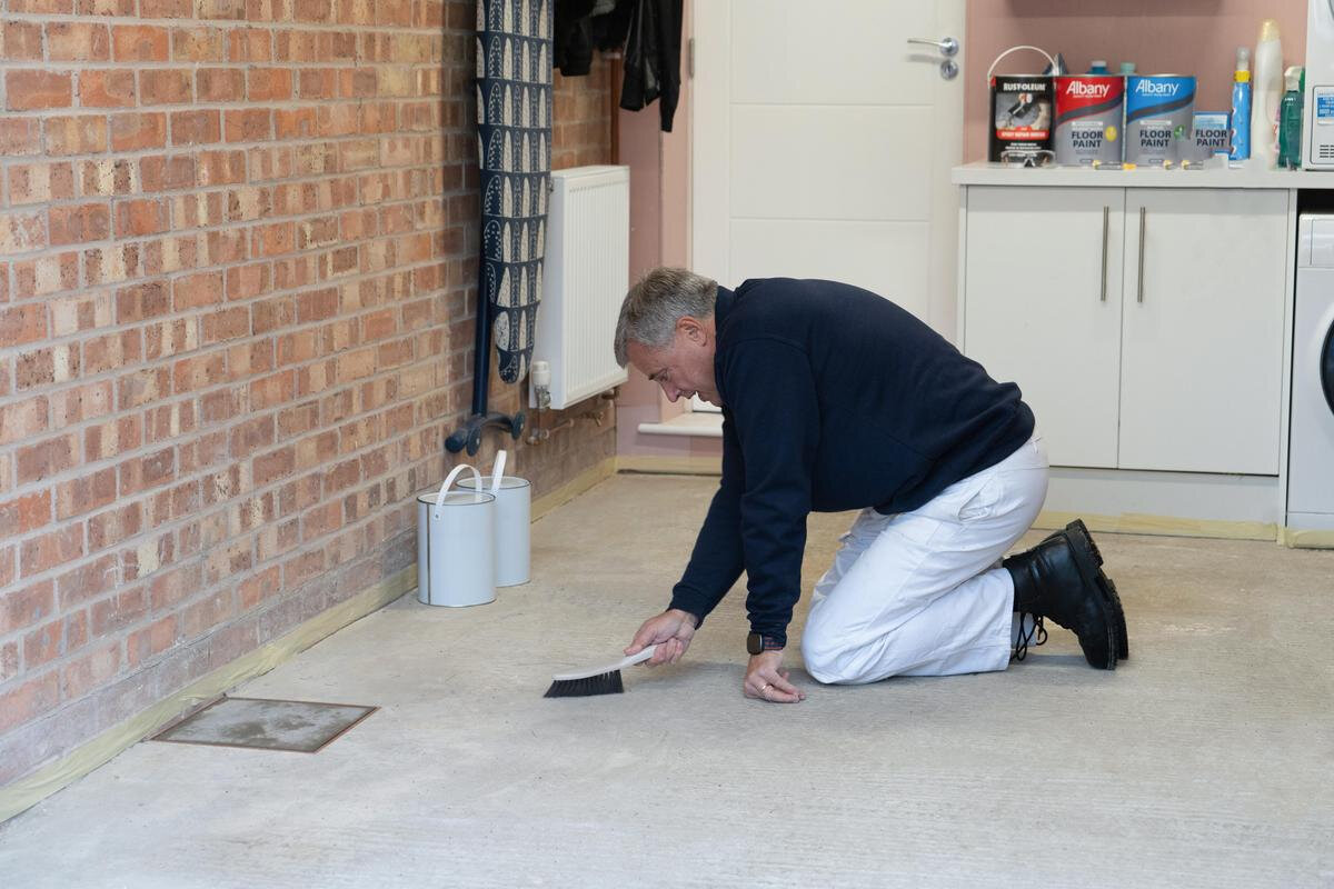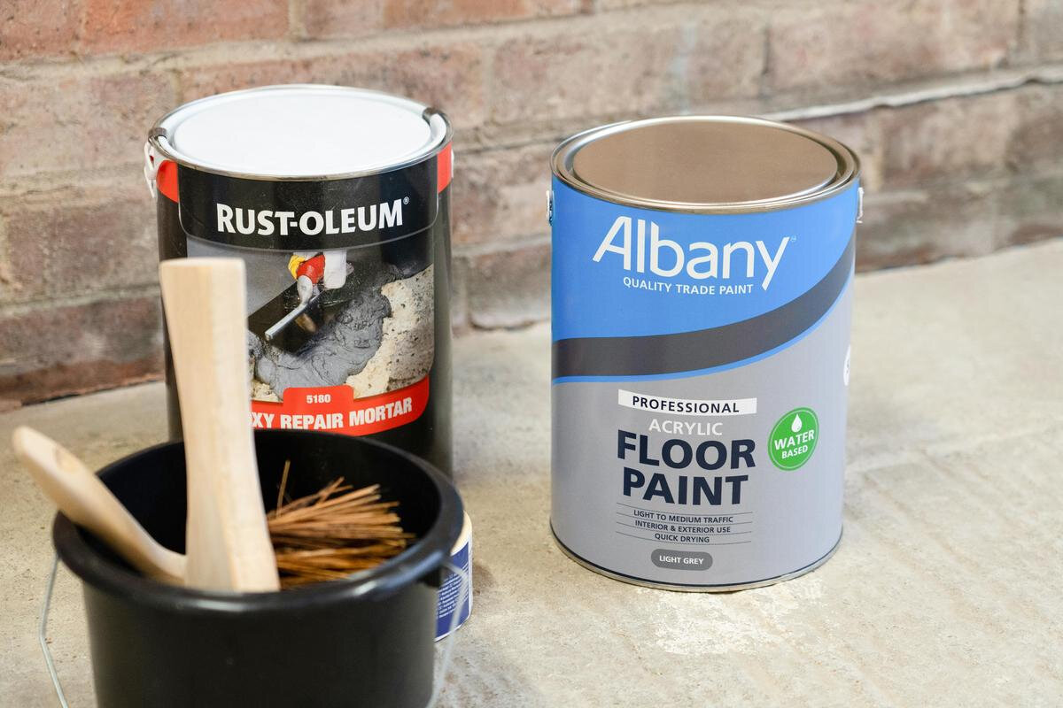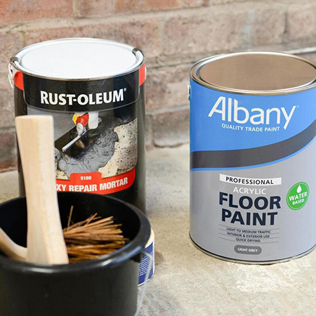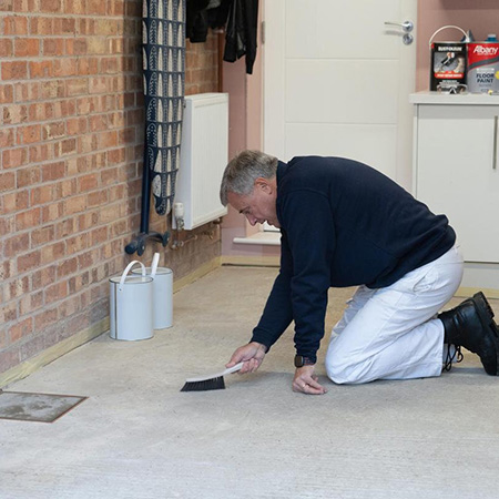 Before you conduct any other prep such as repairs or giving the floor an abrasive key, make sure the entire surface is cleaned with the recommended cleaner. Follow the manufacturer’s instructions. Carry out any necessary repairs to the floor before you prepare for painting.