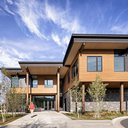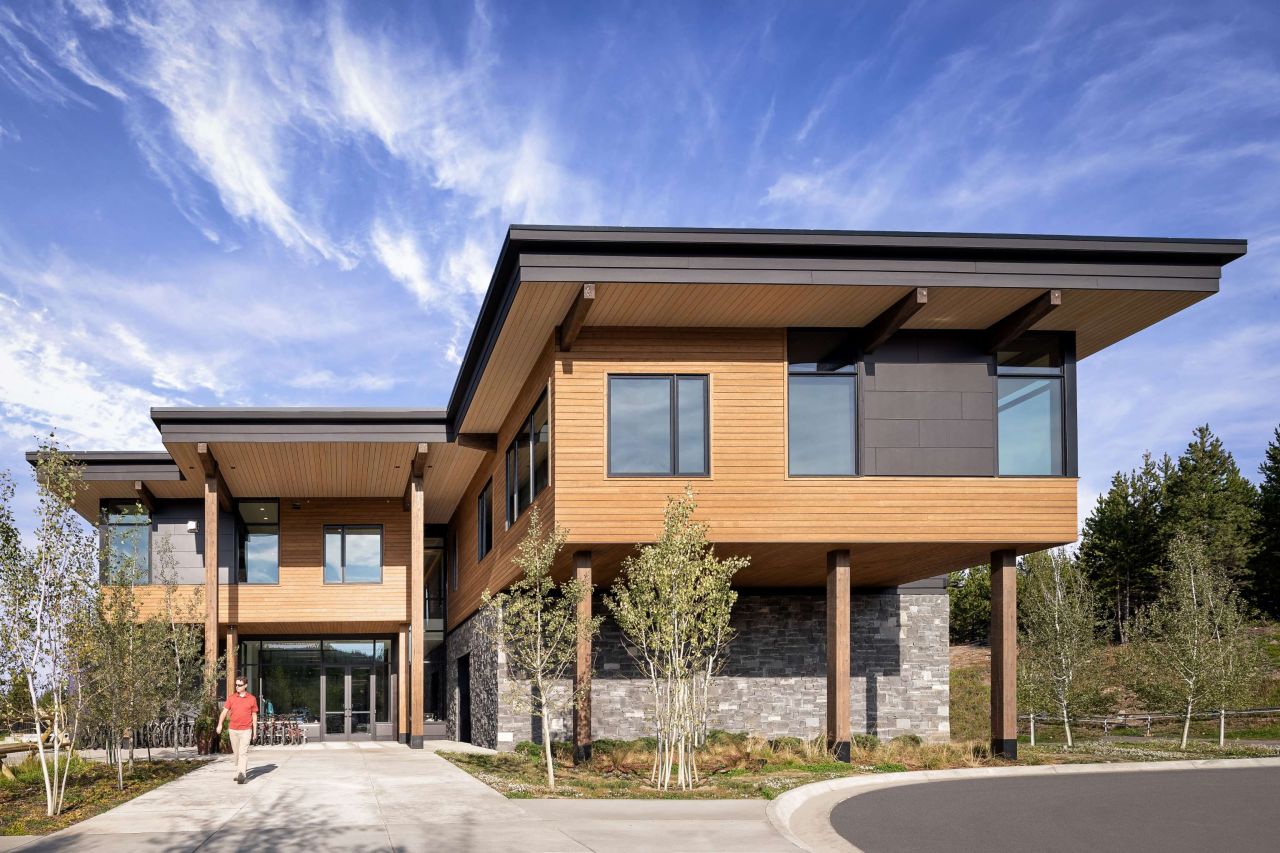 Located in the pristine wilderness of Montana, Ulery’s Lake Lodge is a private club offering breathtaking views of Lone Mountain. The material palette, featuring wood, stone, steel, and Swisspearl fiber cement panels, was chosen to create coherence throughout the network of cabins while blending with the natural forest colors.