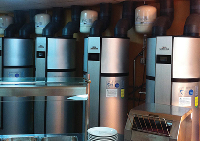 The canteen servery was an uncomfortable place to work as it was so hot and humid. Thanks to Ecocent technology, the excessive heat can be harvested and the hot water for the pot washers and kitchen sinks produced cheaply. Also, the working environment is a lot more pleasant because the excess heat is being harvested and used by the Ecocent units and cool air is being supplied by the units to the working areas.