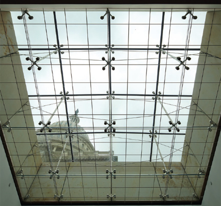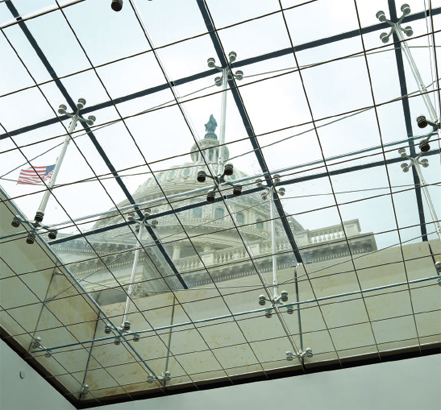 The United States Capitol Visitor Center is constructed below ground so as not to detract from the existing landscape. Novum was contracted by the architect to develop six skylights for the facility so that visitors could view the Capitol Building from below ground. The skylight sandwich consists of laminated glass at ground level, tension rod trusses, a lightweight cable catch net and laminated viewing glass at ceiling level. To maximize transparency for easy viewing, Novum engineers eliminated the need for mullions by utilising point-supported glass supported by tension rod trusses.