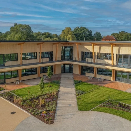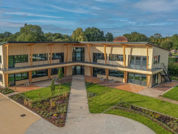 Timber frame specialists Timber Innovations undertook the design, manufacture and installation of both the primary glulam frame and the prefabricated wall panels for the new headquarters. The project required non-combustible insulation, and exceptional thermal and airtightness performance were required to meet the Passivhaus standard. Timber Innovations used Knauf Insulation’s Supafil® Frame glass mineral blowing wool to insulate the panels.