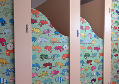 Cubicle Centre provided toilet cubicles, vanity units and bench seating for three different washrooms. The school wanted to take advantage of the exclusive vinyl designs on offer. But which should they choose? Well they chose three different designs for each washroom. Colourful Chameleons, Space Adventure and Ocean View. These were applied to the toilet cubicle doors and the front panels of the vanity units.