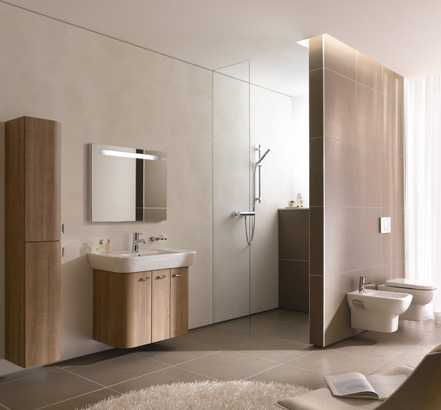 A selection of washbasins in asymmetric configuration allows for the brassware to be mounted on either side while a double washbasin with Matrix mixer is also an option. The WC pans are back-to-wall, wall mounted or close coupled with a matching bidet.